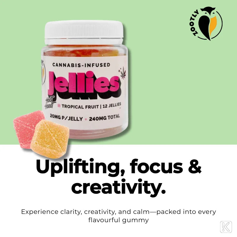 Indulge in a burst of tropical flavour with Hoot Hooot Tropical Fruit Jellies, infused with 240 mg of premium hemp-derived extract. Each colourful jelly delivers 20 mg of CBD Plus, offering a blissful and flavour-packed way to unwind. Perfect for those seeking a stronger, more elevated edible experience, these tropical treats melt away stress and leave you feeling calm, relaxed, and ready to “get your hoot on.”
